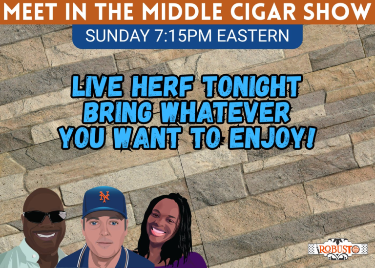 Hey Everyone! We hit the Live Button! It’s Sunday 10/5 – The Meet in the Middle Cigar Show is Live now, bring a cigar and smoke what you like. Change in plans; Sean Williams rescheduled. So Hyacinth and Mark got…