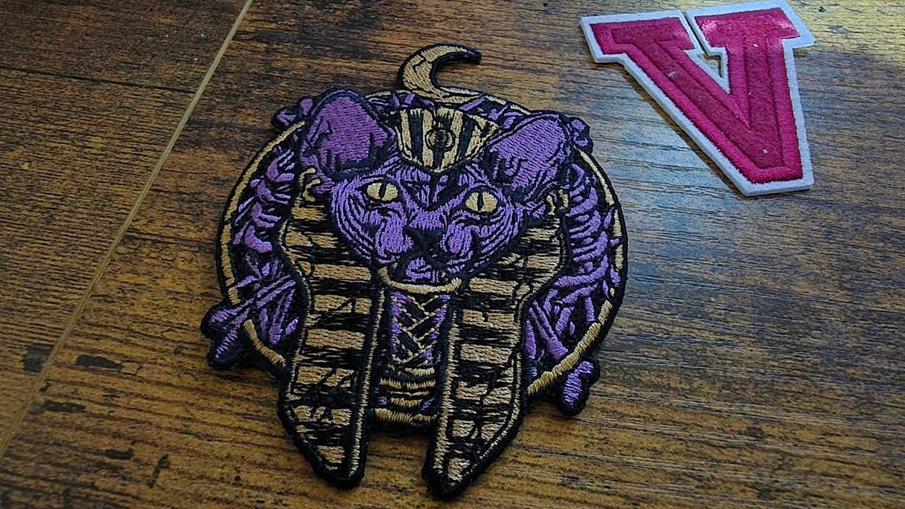 I am tired of wearing other people’s logos. I found this incredibly cool embroidered patch of a “Pharaoh Cat.” It’s gold and purple, it’s regal, and it looks like something from a cyberpunk Egyptian future.